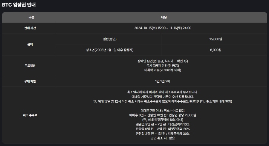 - 입장권 판매 기간 : 2024.10.15(화) 15:00 ~ 11.16(토) 24:00
