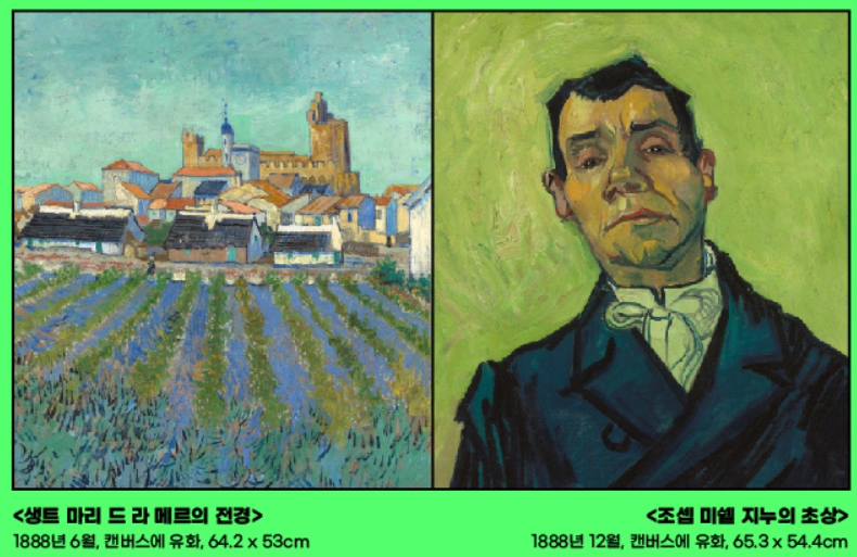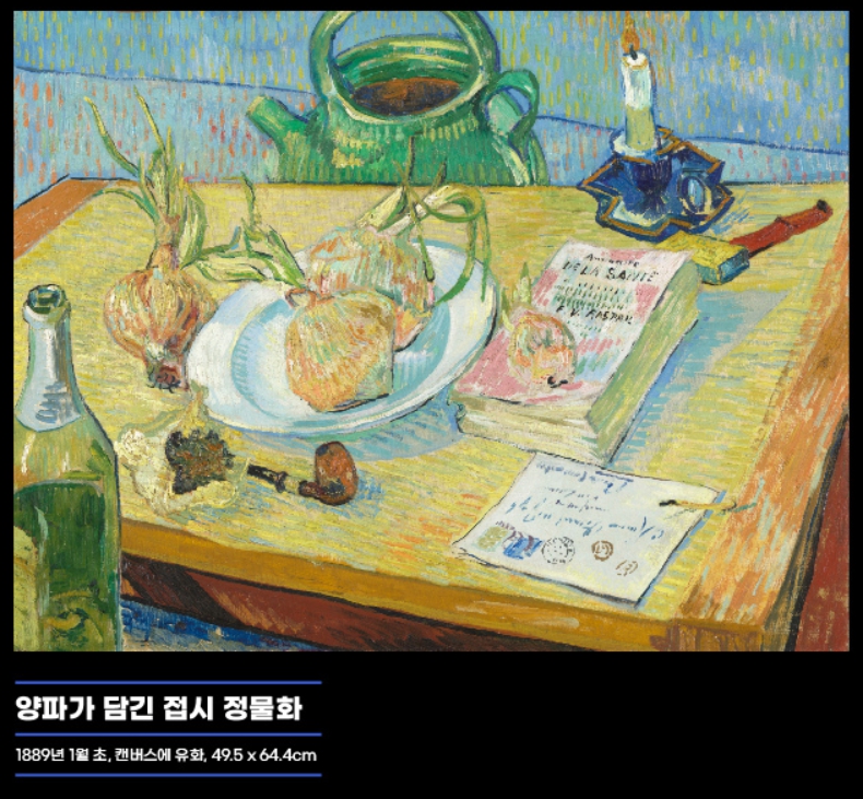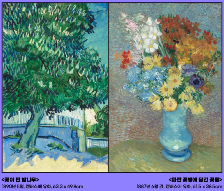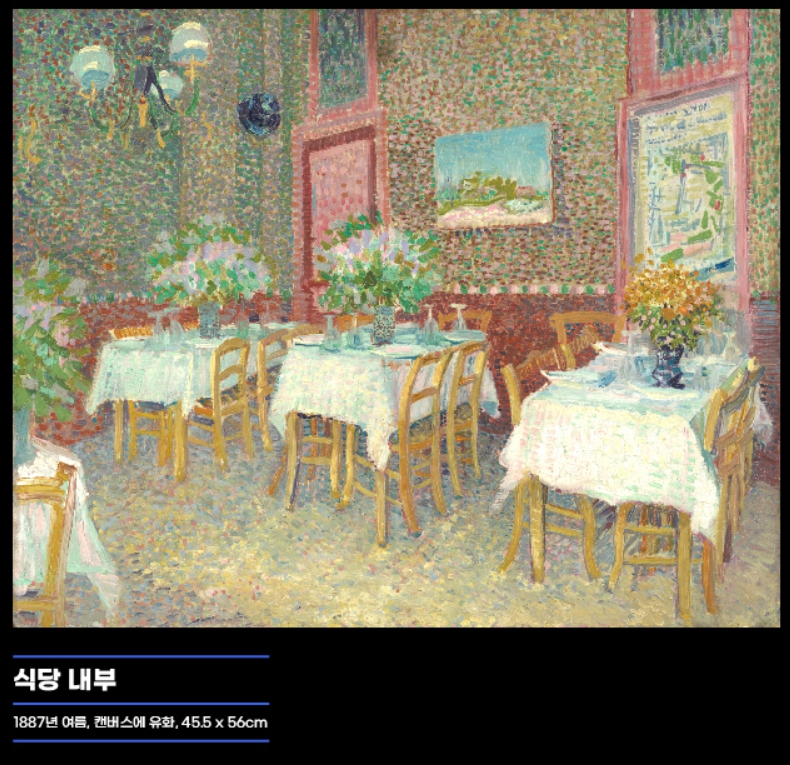 - 다양한 작품 구성: 반 고흐의 풍경화, 인물화, 정물화 등 다양한 주제의 작품들이 전시되어 있어 그의 폭넓은 예술 세계를 경험할 수 있습니다. 또한 연대기적(네덜란드 시기, 파리 시기, 아를 시기, 생레미 시기, 오베르 쉬르 우아즈 시기)으로 전시가 구성되어 시기적으로 반 고흐의 작품 변화 등을 감상할 수 있습니다.