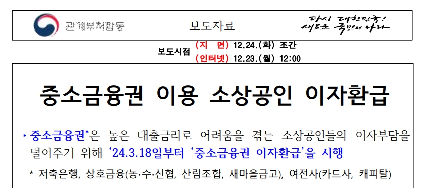 중소금융권 이자환급은 중소금융권(저축은행, 농‧수‧신협, 산림조합, 새마을금고, 카드사, 캐피털)을 이용하는 소상공인에게 이자 부담을 덜어주기 위해 마련된 제도입니다.