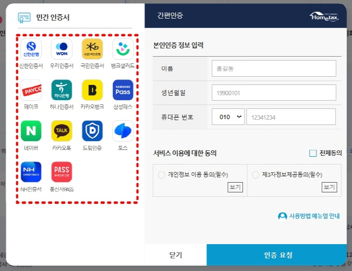 - 본인 인증: 휴대전화, 공인인증서 또는 간편 인증 방식 중 선택 가능합니다.