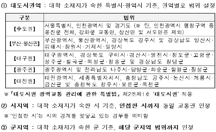 - 교통권 기준은 대도시권역(서울, 부산, 대구 등), 시지역, 군지역으로 구분됩니다.