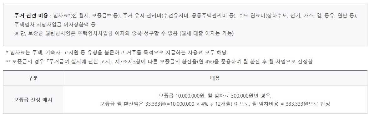 - 임차료(전·월세), 관리비, 수도·전기·가스 요금, 주택 대출 이자 상환 비용 지원 가능합니다.