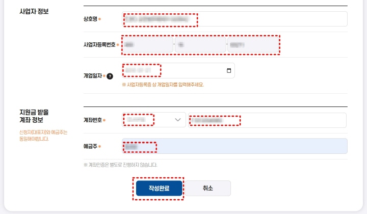 7. [신청정보 입력] 단계에서 신청자정보, 사업자정보, 지원금 받을 계좌 정보를 입력 후 [작성완료] 선택