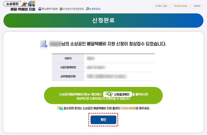 9. 신청완료 화면에서 [확인]을 선택하여 소상공인 배달택배비 지원 신청완료