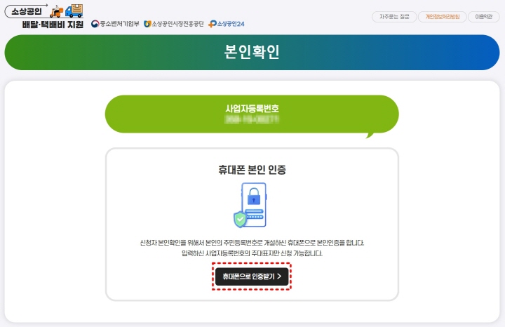 1. 소상공인배달택배비지원.kr 홈페이지 접속 후 신청하기 선택