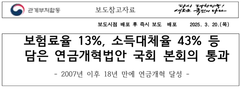 소득대체율 43%는 단순한 정부 방침이 아니라, 공론화 과정과 국회의 논의, 그리고 여야 간 합의를 거쳐 결정된 결과입니다.