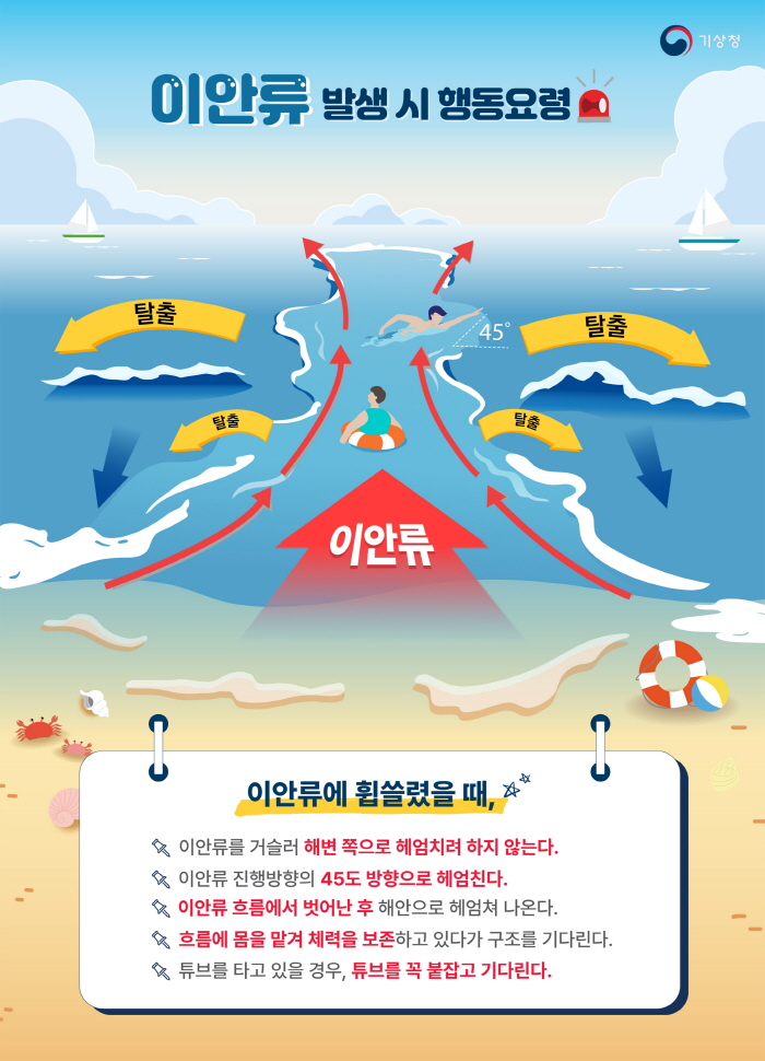 이안류처럼 눈에 보이지 않는 위험은, 사전에 충분한 이해와 대비 없이는 정말 위협적입니다. 하지만 위에서 언급한 이안류의 특징대처방법을 알고 실천한다면, 실제로 바닷가에서 안전하게  피서를 즐기실 수 있으실 겁니다.