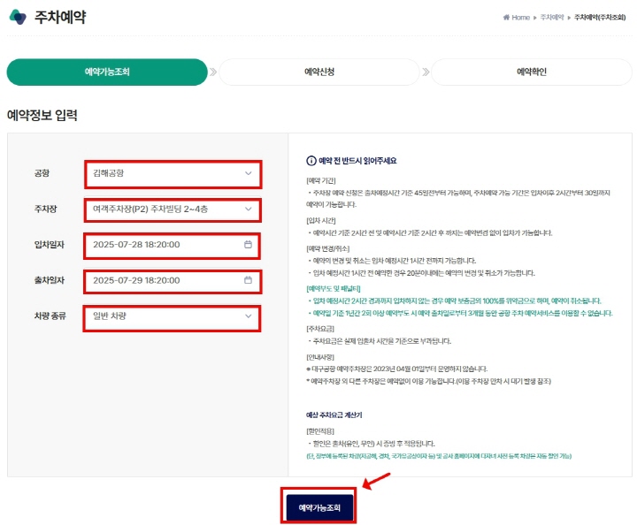 2. 공항, 주차장, 입차일자, 출차일자, 차량 종류를 선택한 후 [예약가능조회]를 합니다.