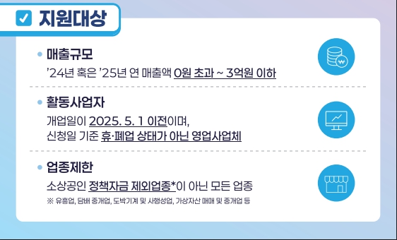 - '24년 또는 '25년 연 매출액 0원 초과 3억 원 이하인 소상공인