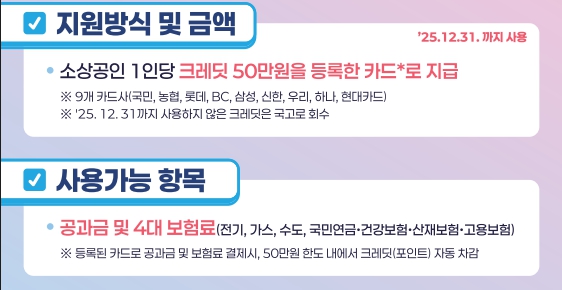 1인당 최대 50만 원의 디지털 크레딧(포인트)이 선불카드나 기존 신용·체크카드에 등록되어 지급됩니다. 지급된 크레딧은 전기·가스·수도요금, 4대 보험료 등 공공성 비용에 사용됩니다.