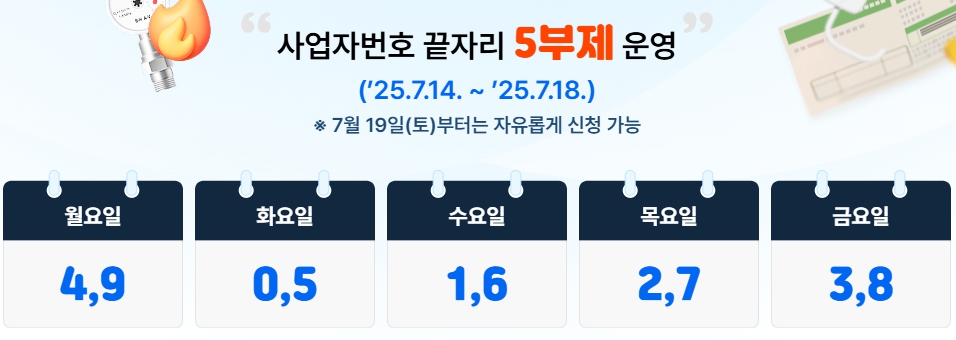 신청 접수는 2025년 7월 14일부터 시작하며, 7월 18일까지는 사업자등록번호 끝자리 요일제를 운영합니다. 7월 19일부터는 요일 제한 없이 자유롭게 신청할 수 있습니다.