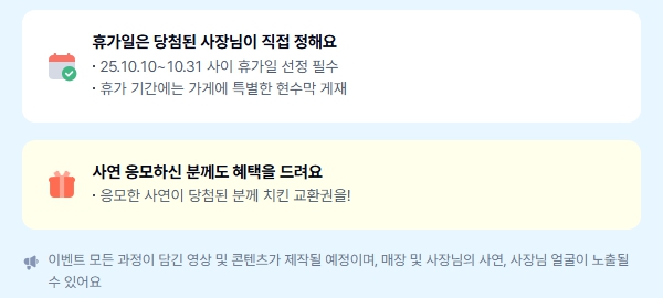 케이뱅크는 열심히 가게를 운영하는 소상공인 사장님들에게 잠시나마 휴식을 드리고자 ‘사장님 유급휴가 보내기’ 이벤트를 준비했습니다. 이 특별한 이벤트를 통해 최대 300만 원의 휴가비와 유쾌한 휴무 안내 현수막, 치킨 교환권까지 받을 수 있습니다. 휴가 일정은 2025년 10월 10일부터 10월 31일까지 직접 지정 가능하며, 가게 휴무를 조건으로 참여할 수 있습니다.