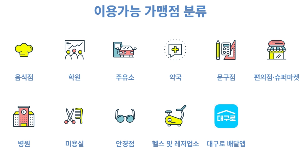 대구로페이는 대구 지역 내 다양한 업종에서 사용할 수 있으며, 일부 업종은 제한됩니다.