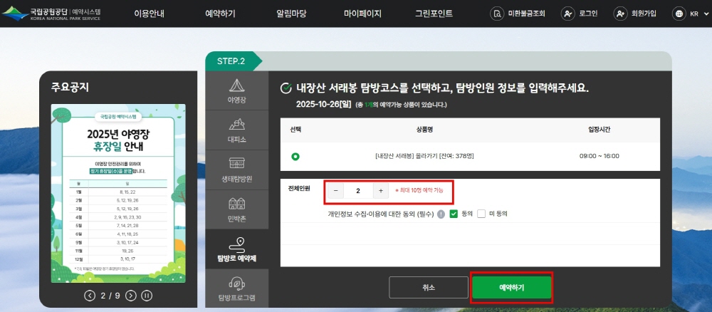 내장산 서래봉 탐방코스를 선택하고, 탐방인원을 입력한 후 [예약하기]를 클릭합니다.