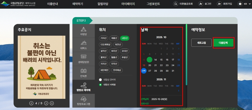 reservation.knps.or.kr 접속 후 내장산 선택 → 서래봉 또는 갓바위 클릭