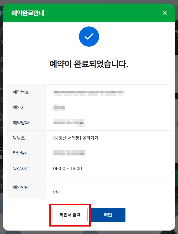예약이 완료되면 확인서를 출력할 수 있고, 카카오 알림톡으로도 QR코드 입장권이 전송됩니다.