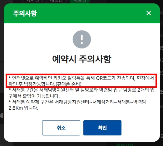 예약 시 주의사항 팝업창을 확인하고 [확인]을 클릭합니다.