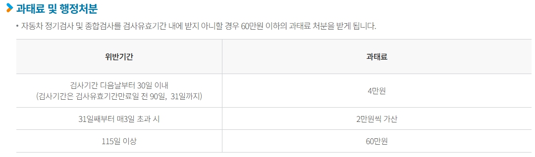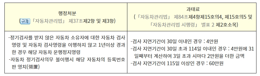 - 운행 정지 명령 – 1년 이상 검사 미실시 시 행정처분으로 운행정지 처분이 내려질 수 있습니다.