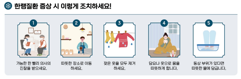 - 동상 증상이 의심되면 미지근한 물(37~39℃)에 20분 담그기, 절대 문지르지 않기