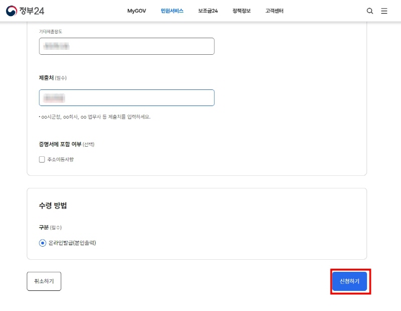 8. 인증이 완료되면, 휴대전화 번호란에 본인 명의의 휴대폰 번호가 자동입력됩니다. 그다음, 아래의 발급용도, 제출처를 입력하고 [신청하기]를 선택합니다.