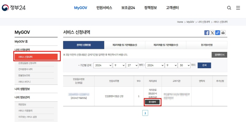 9. 신청하기가 완료되면, 아래 화면과 같이 [나의 신청내역]에서 발급된 인감증명서를 확인할 수 있습니다. [문서출력]을 선택하여 프린터 출력하면 인감증명서 온라인 발급이 완료됩니다.