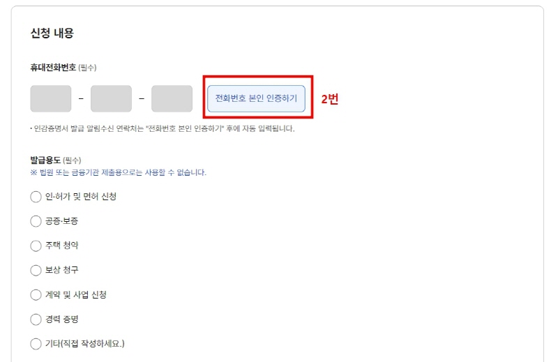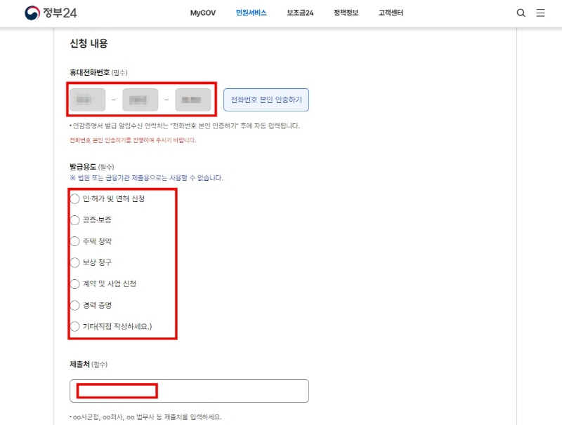 8. 인증이 완료되면, 휴대전화 번호란에 본인 명의의 휴대폰 번호가 자동입력됩니다. 그다음, 아래의 발급용도, 제출처를 입력하고 [신청하기]를 선택합니다.