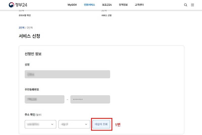 6. 본인의 인적사항이 기재되어 있는 아래 화면에서 [대상자 조회]  선택하고, [전화번호 본인 인증하기]를 눌러 간편 인증을 진행합니다.