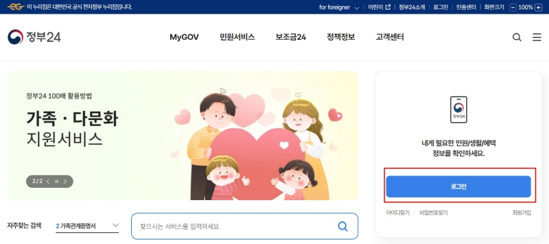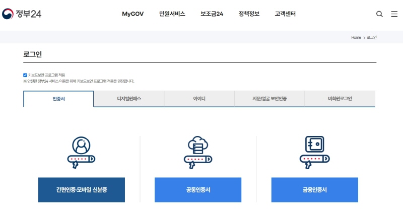 1. 정부24(www.gov.kr) 에 인증서 로그인을 합니다.