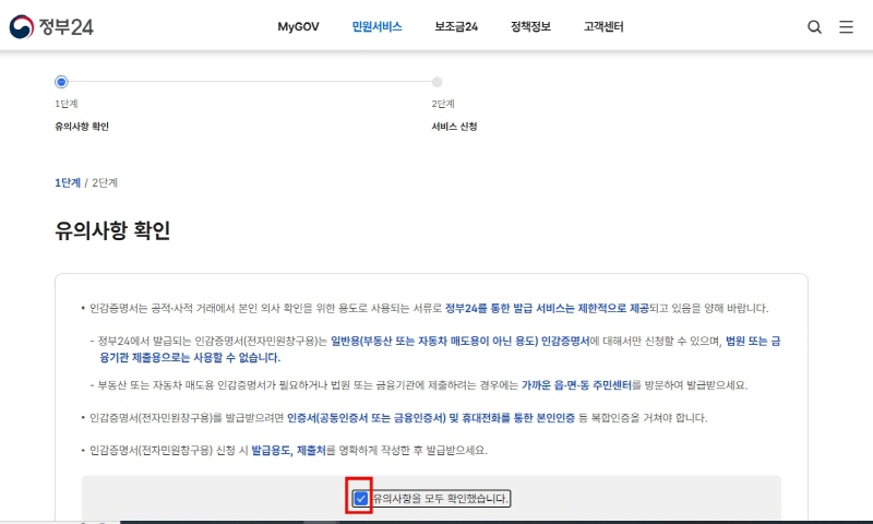 정부24를 통해 인감증명서를 발급하기 위해서는 공동 또는 금융인증서휴대폰 본인 인증이 필요합니다. 따라서 서비스 이용 전에 미리 인증서를 준비해 두시길 바랍니다. 그리고, 인감증명서는 PC에서만 발급 가능합니다.