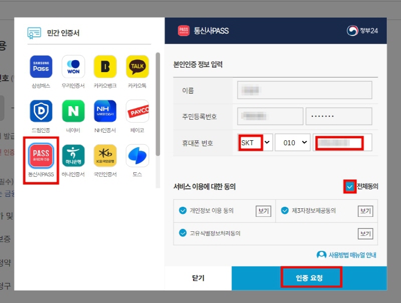 7. 아래와 같이 간편 인증 화면이 나타나면, 본인에게 적합한 인증서를 선택 후 인증요청을 진행합니다. 아래 화면은 [통신사PASS] 인증서를 선택하고, 휴대폰 번호를 입력하고 인증요청을 진행하였습니다.