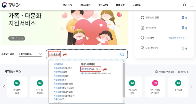 3. 로그인 후 아래 화면의 서비스 검색란에 [인감증명서]를 입력하고, [인감증명서 발급 신청] 서비스를 선택합니다.